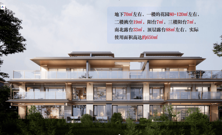 约70㎡地下室+约19㎡餐客厅挑空+约14㎡2/3F阳台+约33㎡南北露台+约88㎡星空露台,套内实际使用面积高达约650㎡
