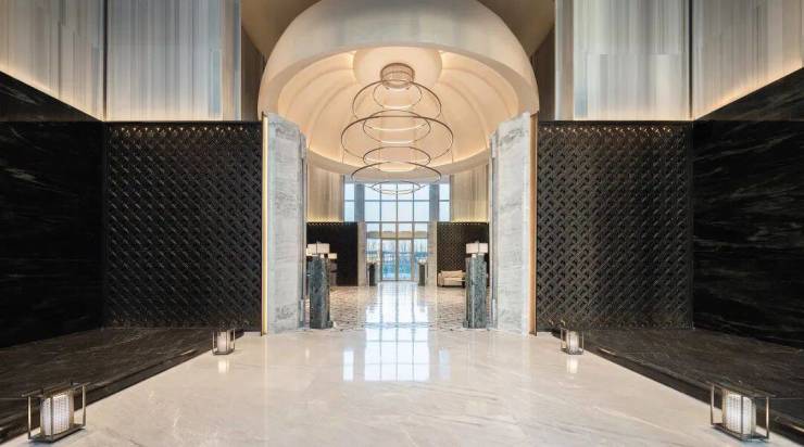 不止尺度,更有奢度。入户大门高约9米、宽约80米,足矣容纳20辆超跑豪车矩阵。大门采用白玉兰石材柱体构成光影矩阵,如同一座"悬浮光殿"的入口,排场奢华至极。