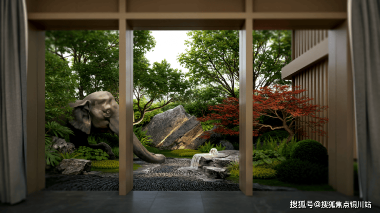 围合式布局筑就递进式归家礼序,社区主入口以酒店式迎宾格局徐徐展开。特选造型松姿迎宾而立,引居者从喧嚣步入宁静;后场花园承载着社交活力与疗愈独处“动见繁盛之境,静生清雅之心”的双重空间体验。在景墙围合之下,叠山理水,以写意笔法勾勒自然轮廓;层林掩映,于秩序中生长盎然意趣。