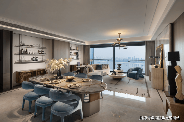 220户型参考酒店式公寓的设计,风格简约而注重细节。幕墙边采用镜面材质以延展景观视野,主背景墙选用白色奢石,地面铺陈浅色天然大理石。墙面搭配烤漆框线与浅色条纹壁布,餐厅辅以胡桃木框线与深色西装面料壁布,并设置镜面迷你吧。窗边设计休闲区域,搭配米色系软装,局部深蓝色单品点缀与硬装相辅相成。