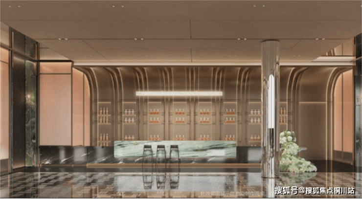 超10米挑高、约26米面宽的豪奢社区归家大门,如江面初升的朝阳,带来四射的光芒;约5.8米高寰幕穹顶的归家通廊,来自君悦酒店的灵感,约1450根定制发光水波纹管,鎏金金属线条交织水纹玻璃,如晨曦洒落江面,光影律动;会所大堂,约3米直径圆形悬浮吊顶与香格里拉翡翠珍罕石材墙面辉映,如月光诉说着江的故事;归家必经的电梯厅,精选奢石纹理,组合形成如江水灵动清冽,让每一次抵达都沉浸于江的氛围。