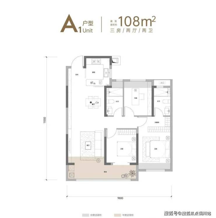 建面约108㎡户型,3大飘窗共计拓展空间约4.35㎡,阳台拓展空间约6.55㎡,实际室内实用面积高达约97.61㎡!