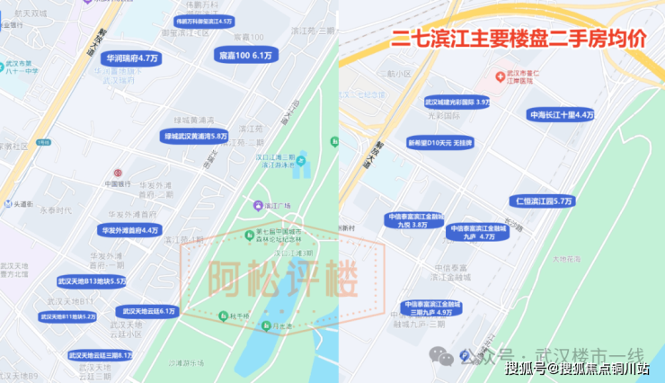 二七滨江主力楼盘二手房均价基本都过了4万元/平,甚至武汉天地云廷三期破了8万元/平,武昌滨江二手房即使核心地段,大部分也才约2-3.5万元/平,只有武汉长江中心二手房均价到了5万元/平。