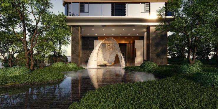 1层花园则以休闲社交作为场景主诉求,打造有无边际水池、雅亭及社区共享会客厅,其中休憩的雅亭采用黑色安哥拉大理石+上海宝格丽奢侈品店同款定制翡翠绿晶化石,品质感满满。