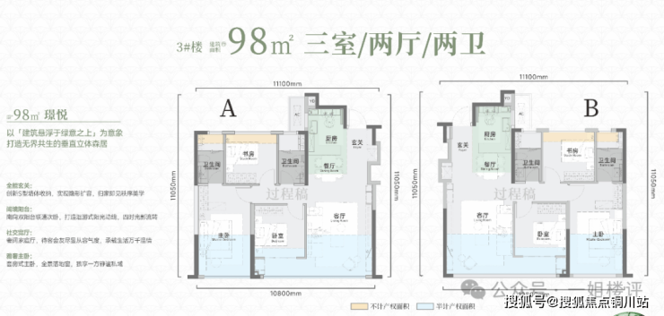 建面约98平三房两厅两卫:3号楼的连廊中间套户型。