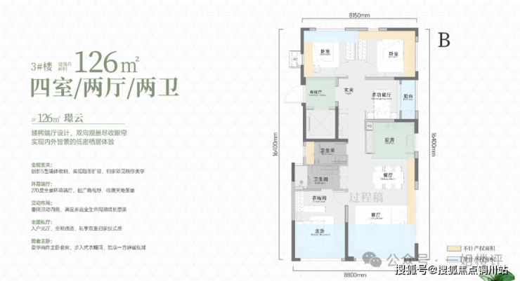 独立电梯入户,270度客厅视野,进门的多功能区外面带有晾晒阳台,北侧卧室双面优化,不足之处就是进深较长。