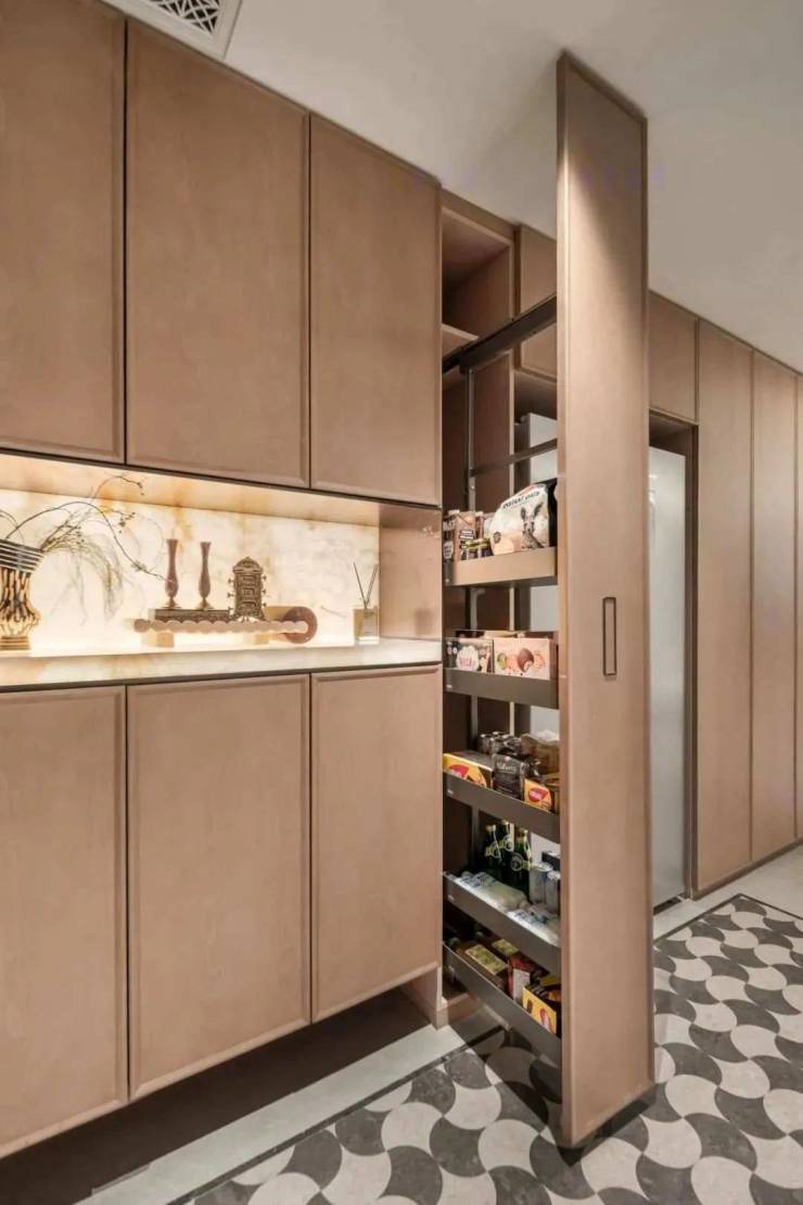 厨房更是堪称美食达人的天堂,集成一系列多功能调味拉篮、定制谷物抽屉等,收纳有序,油盐酱醋间的分类放置烦恼一次性得到解决,琐碎繁杂不再。