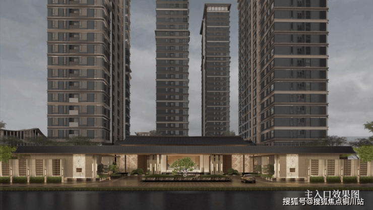 入口会所售楼处略微起翘的双坡屋顶,横向展开,均衡平直,类比于新中式建筑檐口的舒展感;转角独立小楼屋顶的金属挑檐模拟了层叠的古建檐口所形成的自然、简约的起伏;商业和楼栋基座有高度且有厚度的檐口线脚则是廊檐的抽象表达。配合石材、玻璃等现代材料的使用,克制凝练的设计手法,达到在当代转译新中式之美的设计理念。