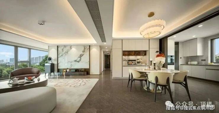 就连入户门厅的金色吊顶,都是用200多片“百合花瓣”造型拼接而成,宝格丽绿石材景墙与福鼎黑花岗岩地面呼应,让每次归家都充满仪式感。