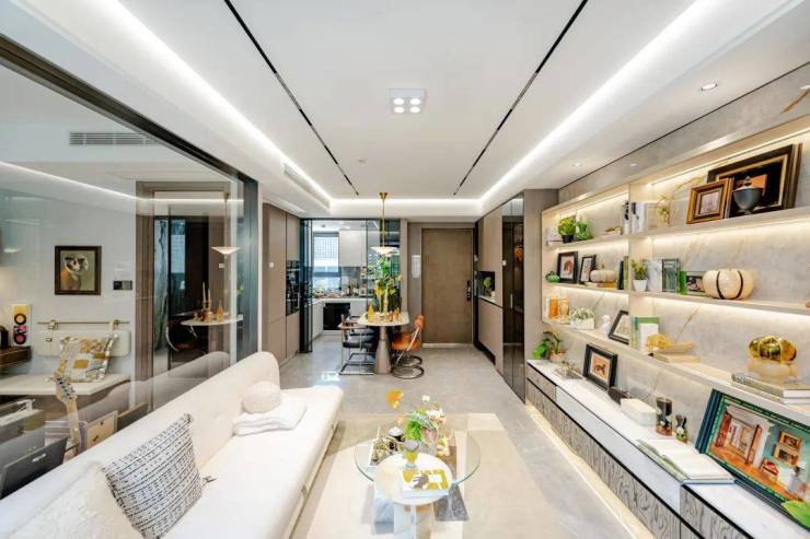 超万元钢木复合门+全屋墙布+全面屏电视岩板背景墙+大面积地砖通铺等,打开室内无界空间感;卫生间大面岩板上墙,汉斯格雅、高仪的卫浴单品和瑞士恩仕智能马桶…完全超配,品质不输南部新城一众豪宅!