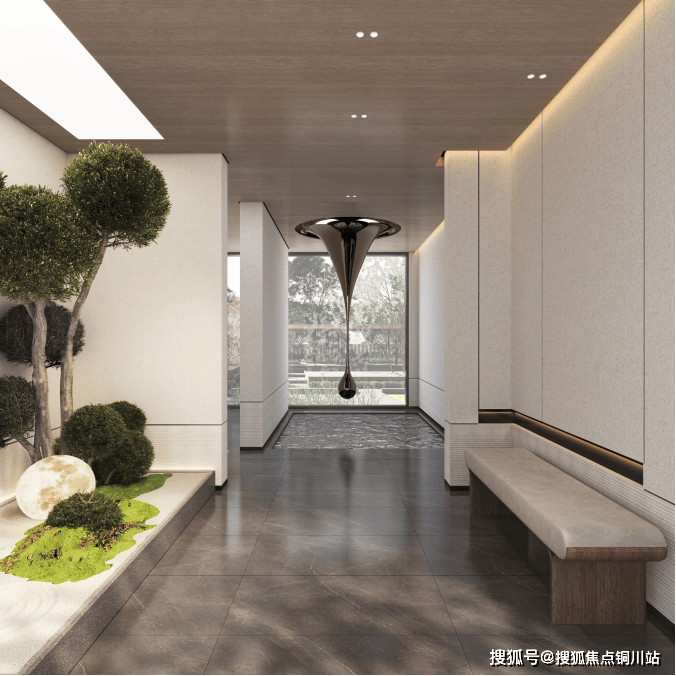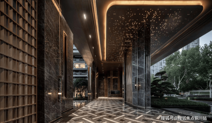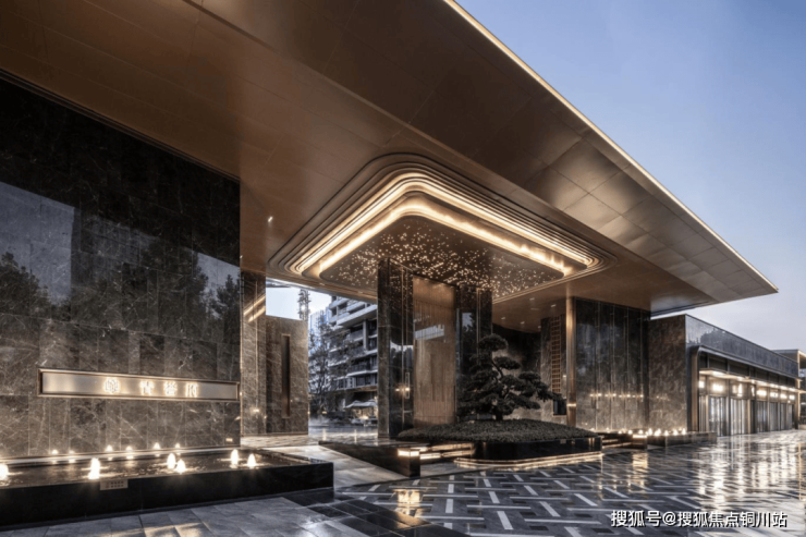 项目规划三重尊崇归家动线,“一进-礼遇”,打造近20米宽的主题水景,大量采用孔雀绿石玻璃及黑金沙进行点缀,雕塑形态取自蜿蜒江流;“二进-府门”,宽近36米,高近10米的高阔府门采用爱马仕灰石材及香槟金铝板材料定制雕琢小区入户,大门正中以现代的渐变格栅塑造障景,两侧真石材墙面结合精致的水景喷泉,正中栽植臻贵造型罗汉松,营造尊贵的归家迎宾体验;“三进-沐林院”,开阔的沐林水院,水域面积超600㎡,涌泉跌水、石台花境等层次丰富的水景,予以身心松弛感。
