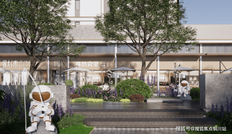项目更新城市界面,打造约2800㎡开放式花园商业街区,精心设计花丛景墙,奢配林间剧场、休憩座椅等,融入景观节点,使得社区“边界消融”、内外链接,营造出一种出入皆被绿意环绕的烟火生活意境。