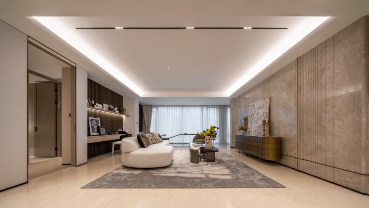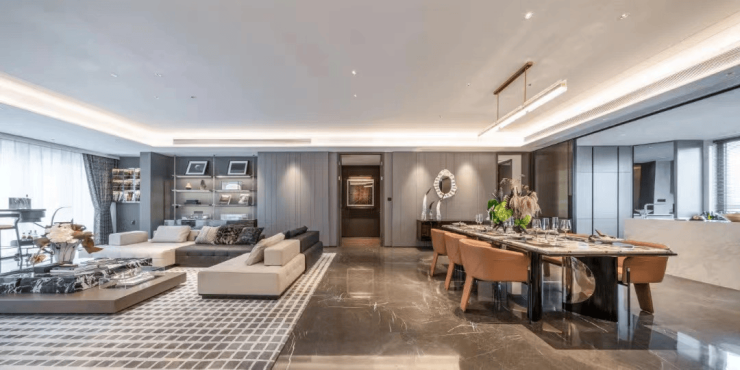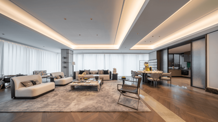 同频世界的极简美学,打造Super Flat超扁平风格;沿袭绿城高端系经典审美,采用系统设计全包阳台,同款苹果旗舰店的全面屏,映照江岸流动的风景;同时,打造慈溪极为罕见的巨幅窗墙比,结合印度蓝石材及香槟金铝线条,于细节之处传达慈溪头部奢宅的贵重气场,让整体效果更加震撼。