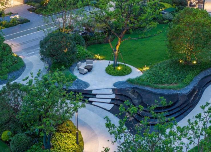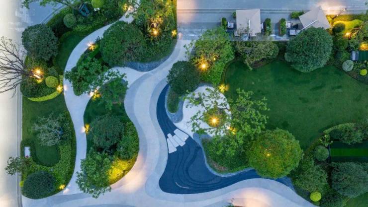 正式进入示范区,首先映入眼帘的,是近3000方的共享会客厅,作为三大中心花园之一,全世界甄选49种植被设计打造,层次丰富,搭配黑山石和水景,营造曲径通幽的归家之路,未来还能增加小业主对于植物的认知度。