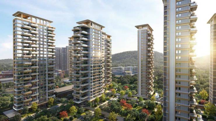 住宅外立面采用凤鸟纹、重檐线条,采用弧线、铝板、蓝钻玻璃与塔冠造型,飘逸典雅。实景园林里,融合荆楚文化中的凤舞雕塑、编钟灯墙、武汉印象的木刻雕塑,让人记得起历史。
