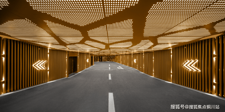 车道位置采用充满艺术造型的冲孔铝板,辅以射灯点缀和墙面双头射灯等设计,呈现秩序之美。