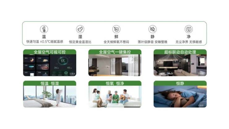 以“智慧家庭”为例,君一联动海尔智家、三翼鸟,为用户提供全屋智能场景、全屋家电聚合、智能空气调节、全屋WIFI、手机APP智控、全屋语音交互等系统。在居者普遍关心的空气健康方面,为用户提供全维全季,可智能调节的“六维智恒”(恒温、恒湿、恒鲜、恒静、恒净、恒智)智能空气解决方案。