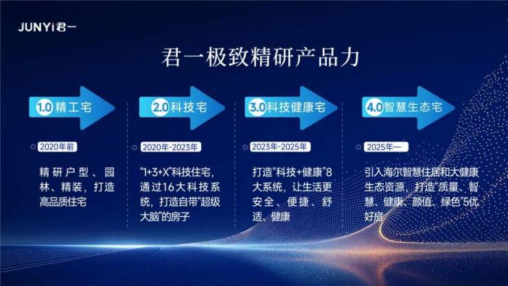 在产品层面,君一积极响应国家“好房子”建设战略,承接用户持续升级的美好住居需求,融合三翼鸟、斐雪派克、卡萨帝、博洛尼等高端品牌,创新打造 “4.0 智慧生态宅”。该产品构建 “智慧宅、健康宅、品相宅、舒心宅、绿色宅”5 优产品体系,部分标准已在“海尚府系”产品落地,切实提升生活的便捷度、智慧感、健康值与舒适度。