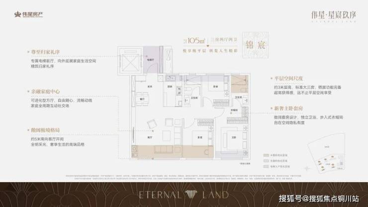 建面约105㎡三房两厅户型,虽为门槛级产品,却拥有约11.3米的南向面宽,客厅开间可达5米,小面积也能带来平层级的享受。