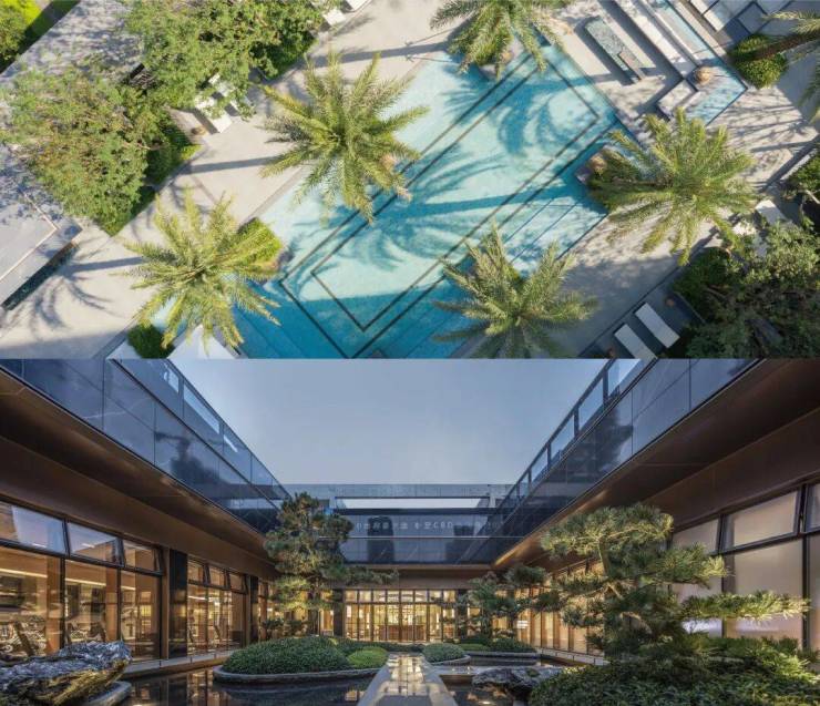 社区内部,近万方的中庭花园豁然展开。项目在规划阶段即采用围合式布局,主动留出中央区域作为近万方的中央艺术花园,实现近百米的南北纵深,营造出庄园般的尺度感。园内以乌桕、红枫等主题林木搭配疏林草坡,四季色彩流转;下沉艺术庭院藏于地下,超5米飞瀑倾泻而下,与黑金沙石材为底的水池、池中的红梅共同构成了简约禅意的空间意象;中心会客厅以曼谷四季酒店为范本,辅以普拉达绿奢石立柱,细节处尽显考究。