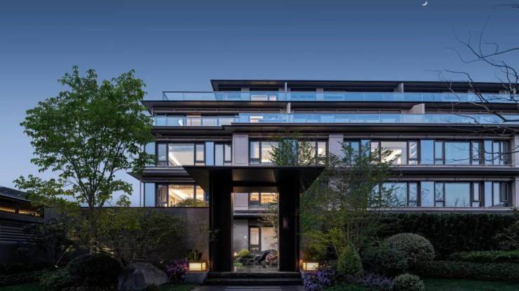 宋风建筑美学:丹枫云庐以创新的宋风设计为特色,将宋代美学与现代建筑理念完美融合。设计团队邀请了多位行业大师,经过 5 个月的调研和 4 个月的方案迭代,最终呈现出独具韵味的建筑外观。项目汲取宋式坡顶与挑檐,遵循现代高端镜面立面趋势,臻选高级铝板、石材勾勒建筑轮廓,搭配三玻两腔降噪隔音玻璃,勾勒出光影交错、高大恢弘之姿。