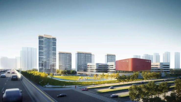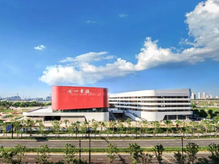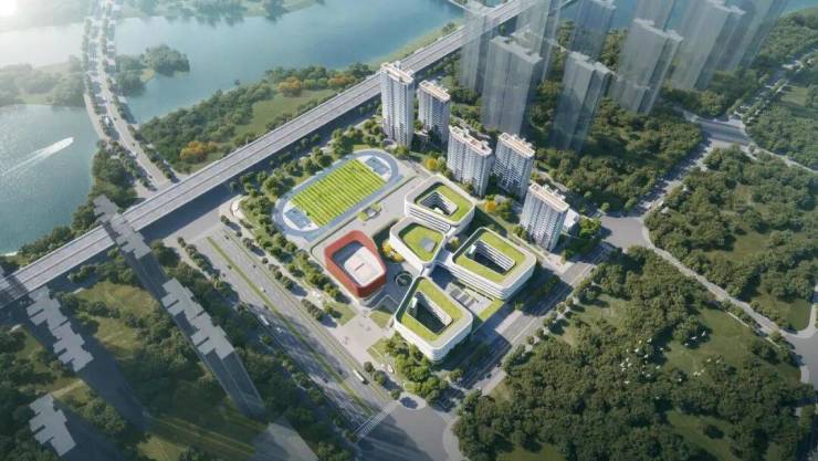 幸福湾·星樾校园区与居住区建筑面积比例约为1:1,规划为九年一贯制学校(七一幸福学校),公园绿地景观7100㎡。校园相对于周边高耸且安静的住宅区,呈现出低矮的外观,它充分利用了场地的长宽与占地面积上的优势,与周边大型住宅社区错锋相依,既抵消了高大建筑带来的压迫感,同时又凸显了自身在周边环境中的独特定位。