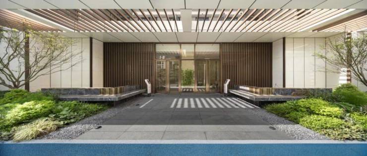 小区入口的归家大门端庄典型,气质趋近于酒店大堂,功能上不止于交通流线或是社区安全节点,更在空间处理上加入了公共会客厅的功能。车辆在大门入口处即驶入地下,为小区营造了人车分流的安居环境。