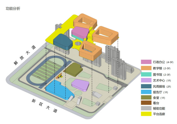 设计中,从建筑布局到环境设施全过程均以服务于学生为核心,采用“组团围合式”的布局模式,分别形成小学教学楼组团、中学教学楼组团、体育中心、综合楼、中学实验楼组团、运动后勤区等,通过连廊结合庭院,将各个功能组团有机联系起来,给学生提供方便、舒适的生活学习环境。