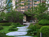 再譬如,现在很多项目都将首层抬高,但仅仅为抬高而抬高,绿城·知海棠则充分利用抬地。一方面做出立体森林景观,叠山理水,水波款款,枝繁叶茂间,浮岛游弋;另一方面,各类动线相互穿插,拾级而上,如同丝带般延展,“未来版西湖十景”渐次展开,无界泳池、下沉庭院、星光水院、疗愈花园等生活场域,人随景动。