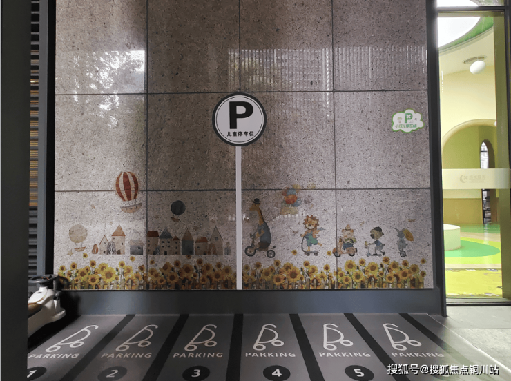 如风雨连廊下专门设置了一处儿童停车场,孩子们的滑板车、溜溜车、摇摇马都能聚集在此,秩序感油然而生。