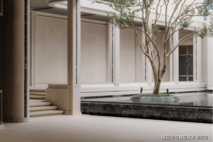 老桩紫薇对植,翡翠蓝石材水景倒映天光,形成浮光掠影的艺术画面。