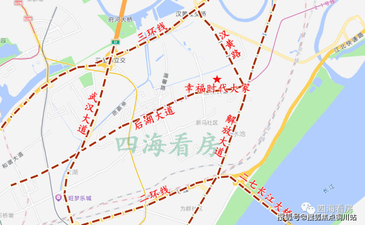 幸福时代大家位于后湖大道与百步亭路交汇处以东,楼市划分属于东后湖板块,行政划分属于江岸区,距离二环线约2.2公里,距离三环线约1.8公里,属于2.5环。