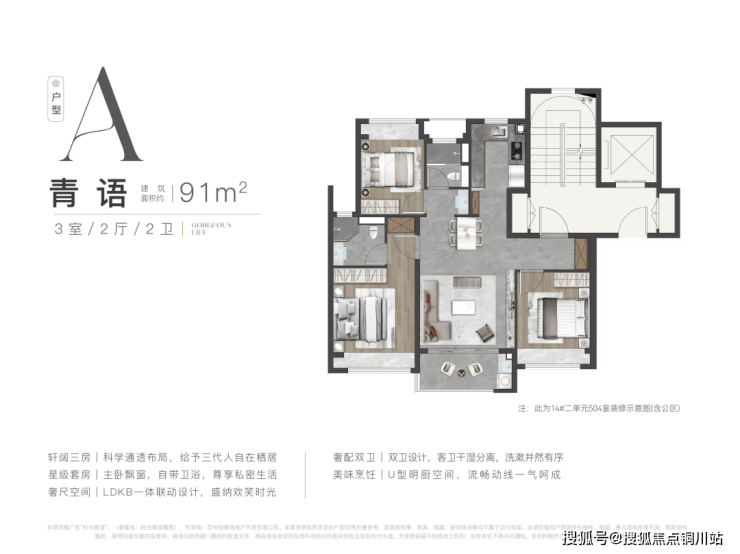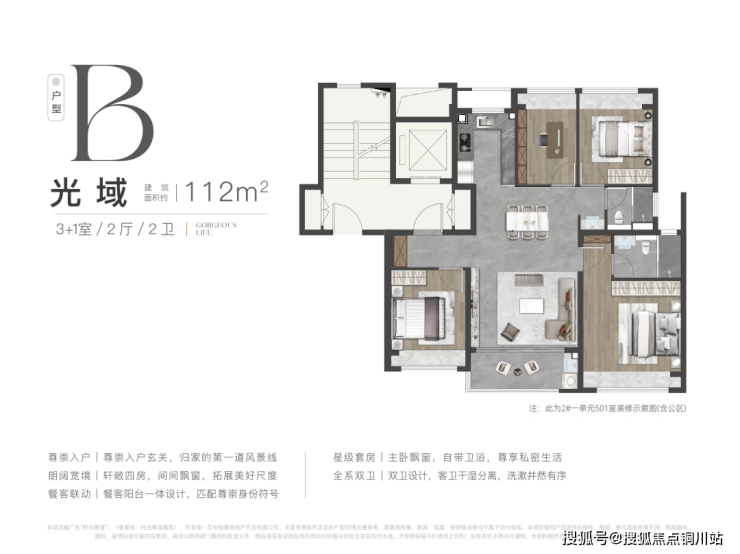 主力在售91/112/128㎡三大户型,一梯两户设计;而且基于洋房产品的极高得房率,全部双卫起步,就算最小的91㎡,也是套房设计