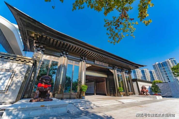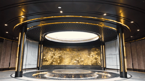 穿过大门,四水归堂的格局豁然开朗——天井下,龙形水画奔腾不息;巨龙雕塑盘踞中央,与苍穹对话;背景墙上,以长江之浪为底的宋徽宗《瑞鹤图》铜雕,与镶嵌圆廊的《千里江山图》交相辉映,寓意吉瑞安康,江山永固。