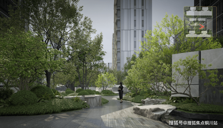 地面庭院四周被景墙包裹,西侧风雨连廊直通社区深处,东侧以高低错落的绿植点缀通道。