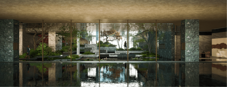 江南水系意象亦被现代转译,如水波纹理的屏风与迎客台、恒温泳池以涟漪状艺术天花倒映池水波光,皆与金鸡湖的流动生机及凤凰扶摇的意境遥相呼应。