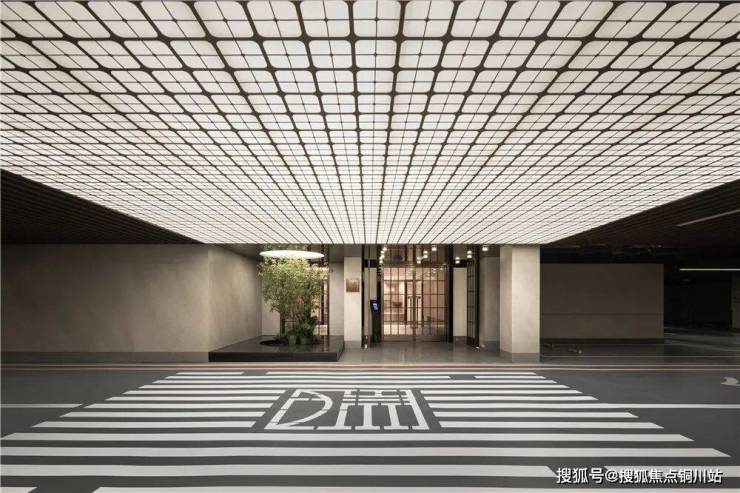 为了增加车库入户大堂的采光和视觉美学,大堂处定制了酒店式符文吊顶,甚至牺牲了入户大堂两侧的车位,做了景观造型并且在顶部开槽模拟自然光照明。