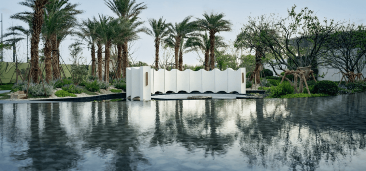 实景呈现的岛屿水院,作为保利天奕五座全球大师花园之一,在银海枣树阵、下沉式庭院、镜面池畔卡座的呼应中,成为未来居者沉浸自然的惬意之地。温柔闲适的落日廊吧,犹如身处海岛之畔,感受蓝调时刻的优雅情调。