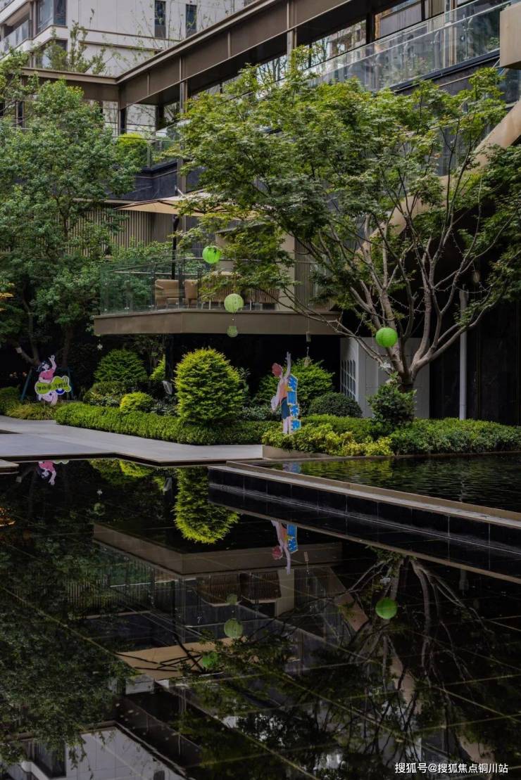 藏于园林核心的约1200㎡下沉庭院,约11米高水晶流瀑成为日常的自然背景板。白天,这里是阳光洒落的静谧书房;傍晚,化身邻里社交的露天剧场。层次叠落的绿植与镜面水景,模糊了建筑与自然的边界,让每一次驻足都成为诗意瞬间。