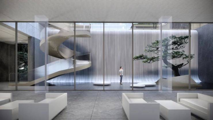 设计师结合项目临河近水的特性,将灵动美感延展到建筑之中,外立面采用太空灰、纳米白和香槟金三种颜色铝板,与石材结合,同时配以大面积落地窗。