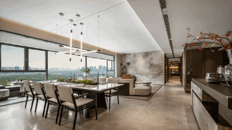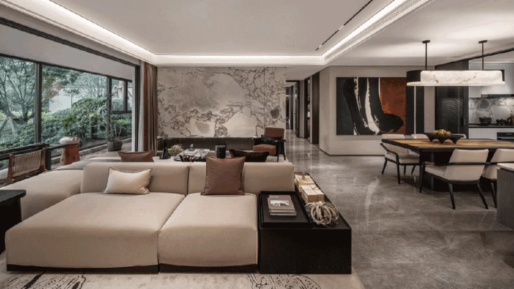 比如博洛尼橱柜,公区简一大砖通铺,厨电是西门子五件套,卫浴是高仪、唯宝等,透光云石、水纹玻璃、云纹岩板等铺装世家大宅的显赫气度。
