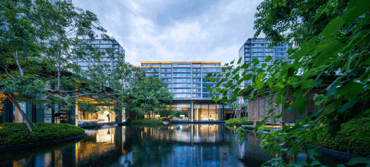 在这里,嬉水池很好地做到了与周边的树荫、映波亭、四水归堂等灰空间连接在了一起,形成了“隔而不断”的丰富社交场景,让浓郁的度假风情,在整个小区内流淌。