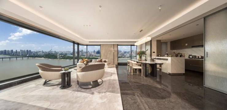 Ultra版环幕客厅采用无界转角270°全景舱玻璃幕墙,搭配8.0m*7.6m超大尺度全景方厅,江景与中庭园林景观双重映入室内,视野实现跨越式升级。
