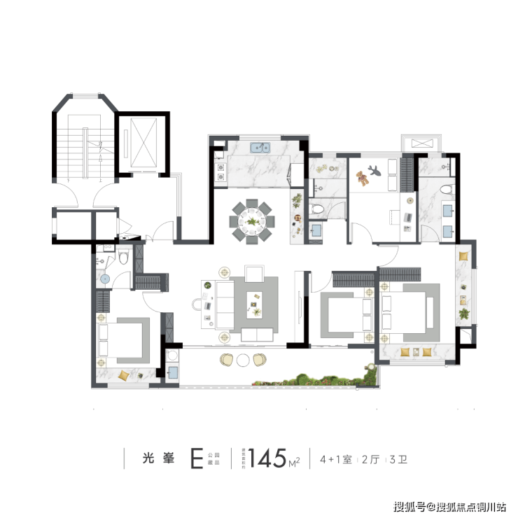 再看建面约145㎡户型,4+1房2厅3卫设计,实用率超过100%!