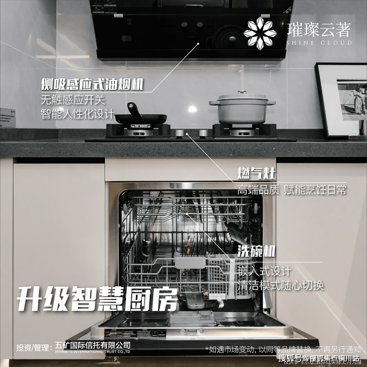 厨房里,有侧吸感应式油烟机和高品质燃气灶,侧吸感应式油烟机可由手势控制开关,做饭也充满趣味感;居家生活的幸福神器洗碗机,璀璨云著也贴心地打点好。