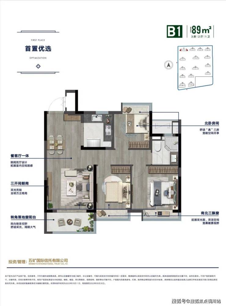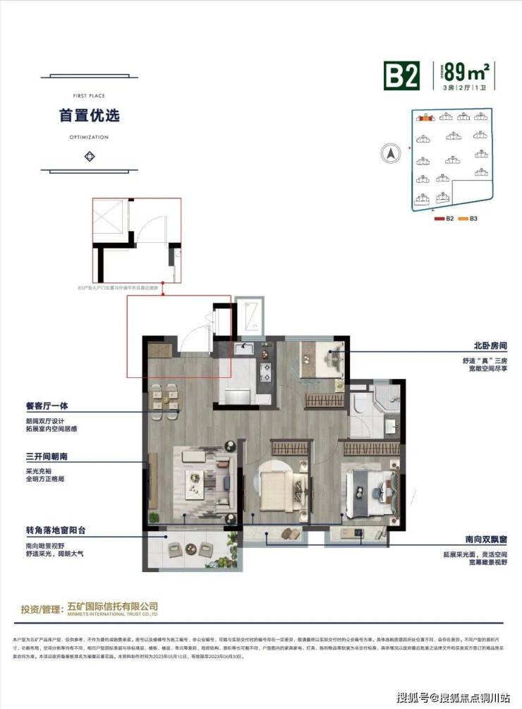 建筑面积约89㎡三房,是首置三房中的“经典款”,有中间户和边户两款可选,都做到南北通透、三开间朝南等设计。两款户型的南向阳台,都采用转角落地窗,采光、观景优秀,窗外的春花秋雨、夏阳冬雪都将成为未来生活的迷人背景。