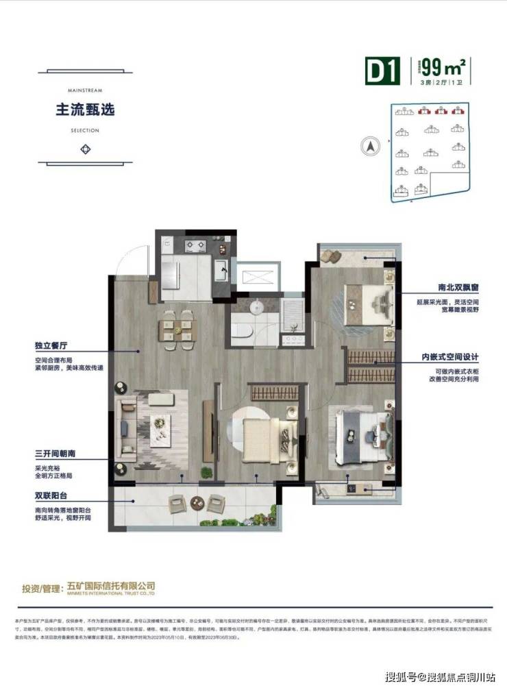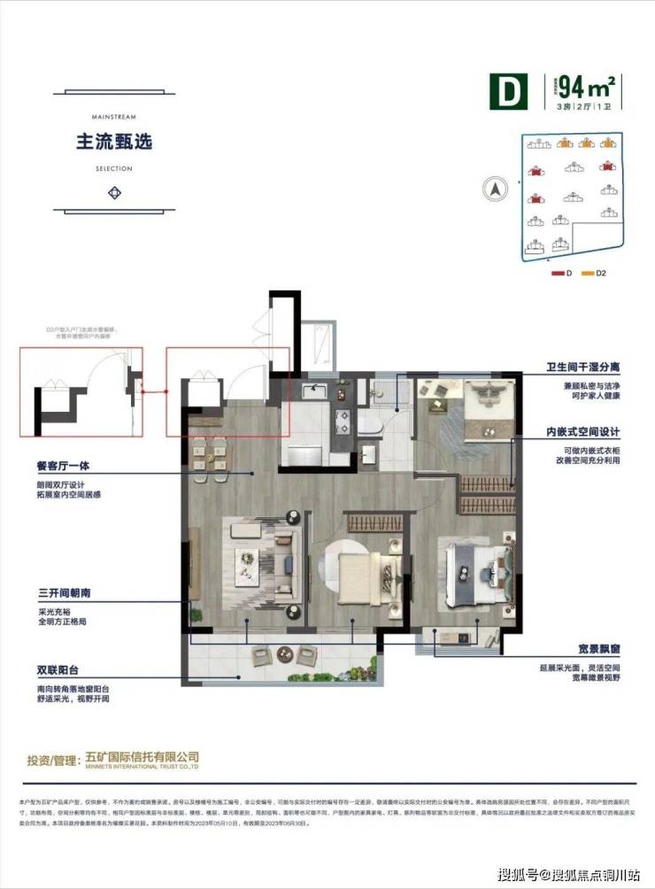 建筑面积约94㎡和99㎡三房两厅一卫,奢阔的南向双阳台,任谁看了都忍不住“wow~”