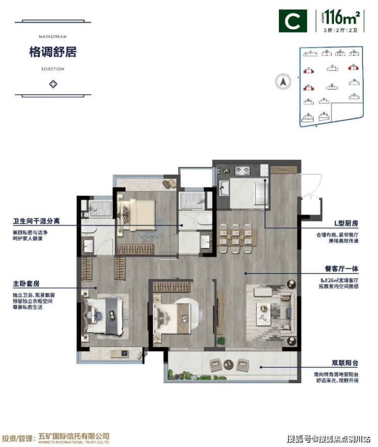 建筑面积约116㎡三房两厅两卫,是改善三房中的“翘楚”。
