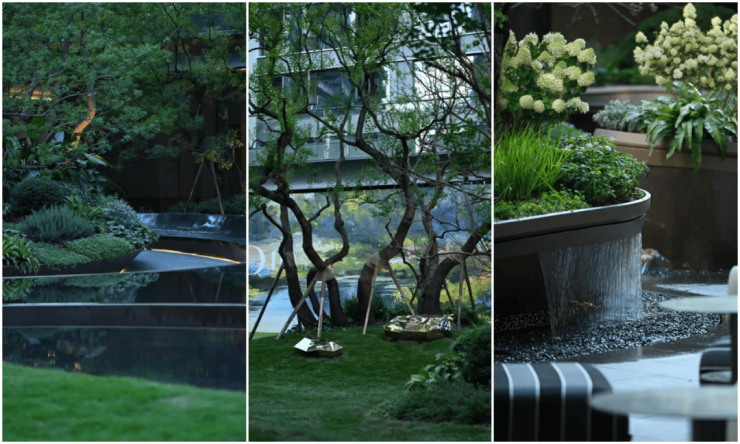 二层的“浮岛”景观设计也极尽巧思,例如,某个角落,一楼层叠、恣意生长的乌桕恰到好处的腾出空间给了“永恒之心”,雕塑的高度又恰如其分的实现了“鸟儿”与“浮岛中人”的“对视”,再配上两边流水的潺潺之音,视觉、听觉在这有限的空间里“无限放大”。