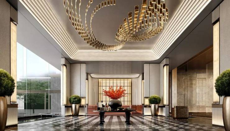 约70米超尺度仪式门庭界面,采用天然石材+铜色金属等高端材质,独具酒店迎宾式归家气质。双精装入户大堂,质感精装地库规格,彰显高端品味与大家仪制。负一层入户大堂,同源故宫天花顶的造景原理,更具艺术感和设计感。